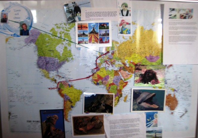 ”Det här måste jag berätta för dagiskompisarna”, säger lilla Lovis minst tre gånger om dagen. Stort som smått. Allt vill hon berätta. Så då och då skickar vi på hennes uppmaning små meddelanden och kort till gänget därhemma. Ofta väljer hon vykort med bilder på olika djur som hon nyligen sett. I Holland blev det en kissande ko. Och här på Galapagos föll valet slutligen på en stor och ryslig Iguana – för den skulle nog pojkarna på avdelningen gilla. I retur får vi de mest underbara kommentarer, frågor, bilder och teckningar.