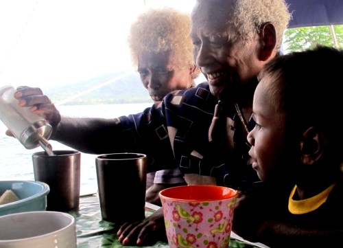 Idag bjöd vi ombord Claus värdfamilj på kaffe och toscakaka, som verkar gå hem även i Söderhavet. Det var första gången som våra gäster var ombord på en segelbåt, och det var tydligt uppskattat. Men folket här är långt ifrån några landkrabbor. De har varit sjöfolk i alla tider, men här är det kanoter som gäller. Och det var också med kanoter som familjen kom ut till oss idag.