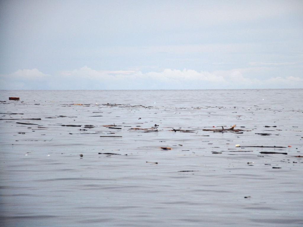 Framför oss ligger ett långt bälte med stockar och skräp, så långt man kan se. Några stockar verkar stå lodrätt i vattnet, så bara ena änden sticker upp. Som toppen på ett isberg. Vi zickzackar oss fram mellan de största, och passar på att dra upp några guldmakrillar. De brukar hålla till kring stora flytande objekt, så också den här gången. Men vi har svårt att glädjas över fångsten. Det hela är en sorglig syn, tyvärr inte helt ovanlig.