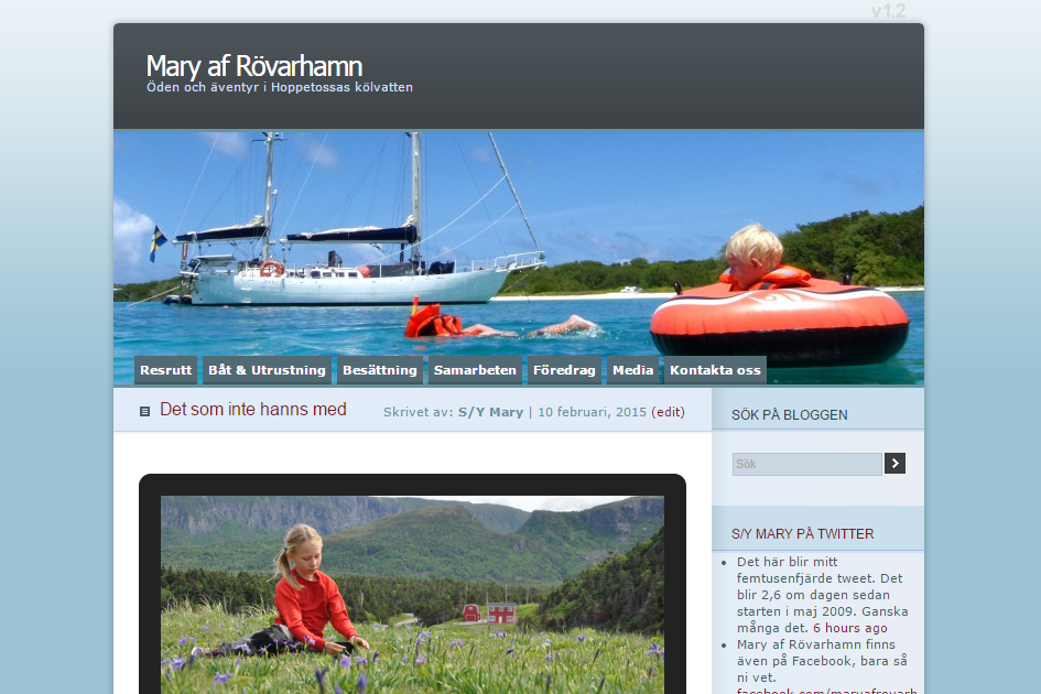 Jo då, du har kommit rätt. Det här är fortfarande www.symary.com, bloggen om familjen Hammarberg som har seglat jorden runt i fyra år. Den har bara bytt utseende, bloggen alltså. Jag tyckte den förra började kännas lite tråkig efter mer än fem år i samma kläder. Hade egentligen tänkt sluta blogga, men så har det ju inte riktigt blivit. Så det fick bli en liten uppfräschning istället. Inga stora skillnader, bara lite större och luftigare. Annars ska det mesta vara precis som innan.