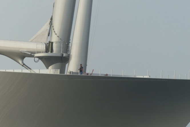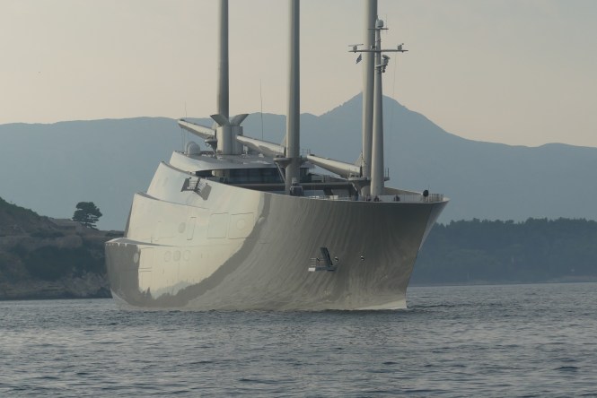 Små gubbar skymtar på däck. A har bara kapacitet för ett 20-tal gäster, utöver de 54 besättningsmän som krävs för att sköta båten!