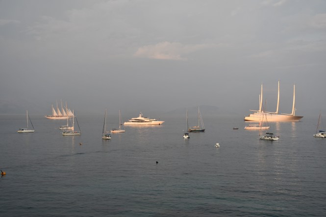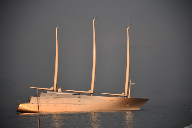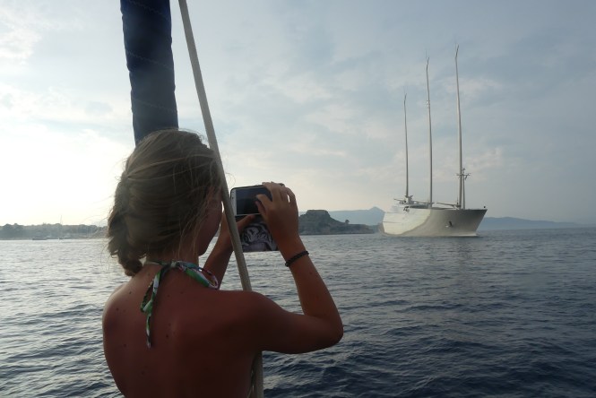 Hon ligger och väntar på oss på ankringen i Corfu Town. Ryska familjen Melnichenkos Sailing Yacht A. Världens största och dyraste privatägda segelbåt, byggd i Kiel och designad av den världskände inredningsdesignen(!?) Philippe Starck. Otto tycker båten ser ut som ett gigantiskt badkar.