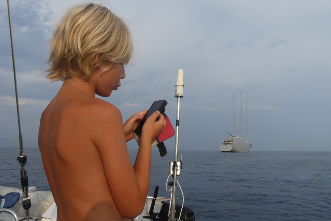 Några pyttesmå gubbar vinkar trevligt till oss från A’s däck när vi glider förbi. De syns knappt över relingen. En annan superyacht med helikopter på akterdäck passerar och ser ut som en leksak i jämförelse.