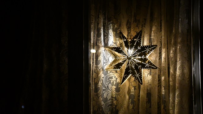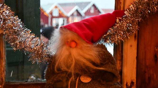 I en av de större bodarna ligger hembygdsmuseumet. Här har man julpyntat som i forna tider. En söt tant bjuder på glögg och berättar hur man firade jul på ön när hennes far var liten pojk. Jag älskar sånt. Kan lyssna i all evighet. Barnen smiter bort till tomten vid granen. Han som berättar kluriga gåtor, och belönar de som gissar rätt med en omsorgsfullt inslagen tablettask.