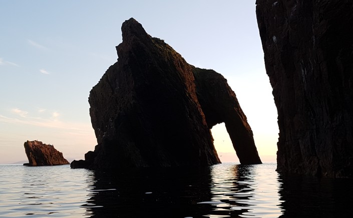 Vi sitter där och ylar tillsammans en stund innan vi återvänder till vår sida av ön. Nu hör vi även sälarna från andra sidan viken, och när vi sitter där i skymningen och spanar ut mot Atlanten i hopp om att få en skymt av den där valen igen dyker istället några delfiner upp bakom båten. Vi ser ofta delfiner, men att ha dem runt sig så här i ankarviken, det är mycket ovanligt.