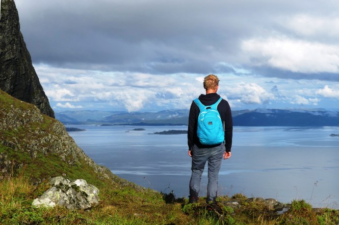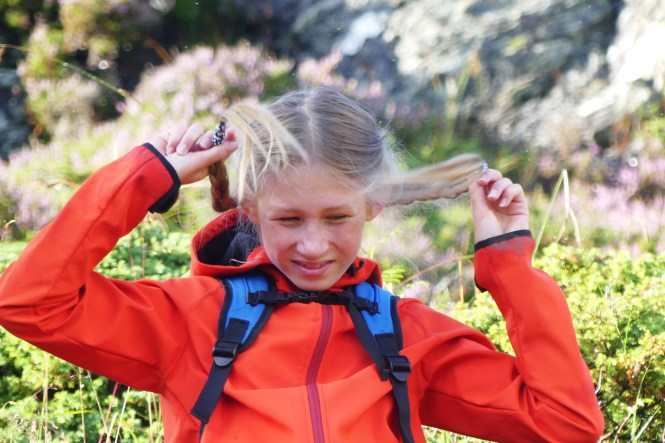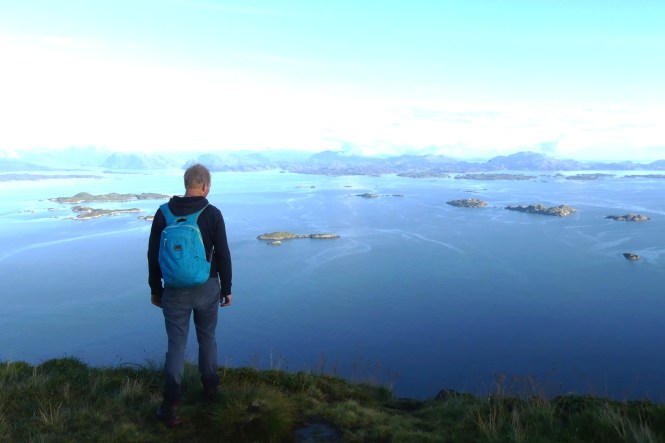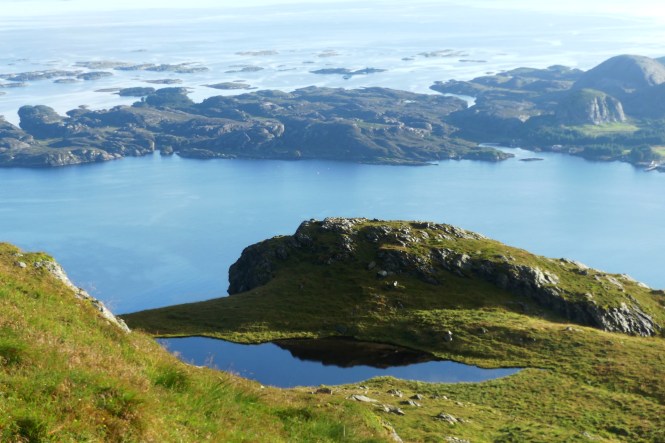 Väl uppe på ryggen av hästen väntade lervälling och svampig torv. Här gällde det att koncentrera sig för att vattnet och geggan inte skulle rinna över kanten på kängorna. Men upp kom vi, och belönades med den mest fantastiska utsikt som njöts ihop med kakor, frukt och godisfackets sista Snickers. Vi såg hela vägen till Kinn, ön där vi gifte oss för 10 år sedan. Resans mål.