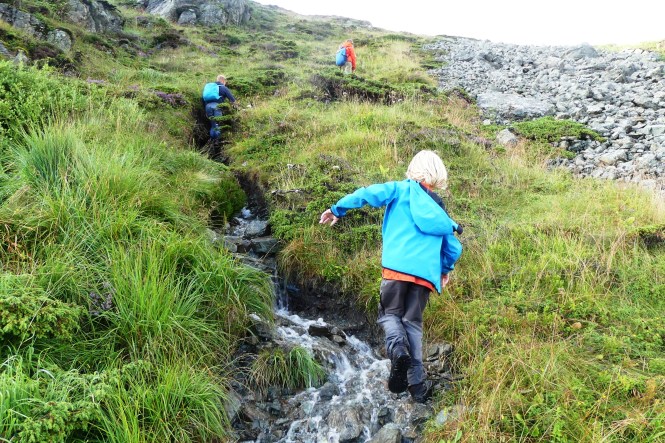 Och blött var det, hela stigen hade förvandlats en bäck med små forsar och vattenfall. De första 300 höjdmetrarna var stigningen brant, och knotten så många att jag satte flera stycken i halsen. Otto muttrade något om den norska pesten, och menade att han föredragit en shetlandsponny. Men han fortsatte, envist och tappert. Ena foten framför den andra.