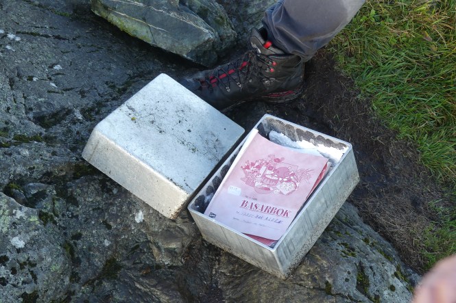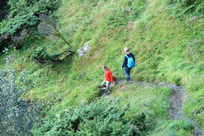 Nu skulle vi bara ta oss ner också. Innan solen gick ner. Det var förstås inte alls lika svettigt som att gå upp, snarare kallt eftersom vi nu var ganska blöta. Och ruskigt slirigt och halt. Jag vet inte hur många gånger stackars Ottos satte sig på ändan. Som tur väl var hittade han då och då några lingon och blåbär där han landade. Sånt hjälper till att hålla humöret uppe.