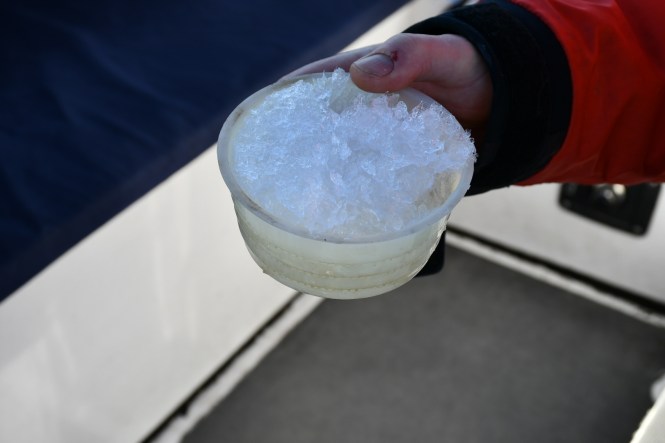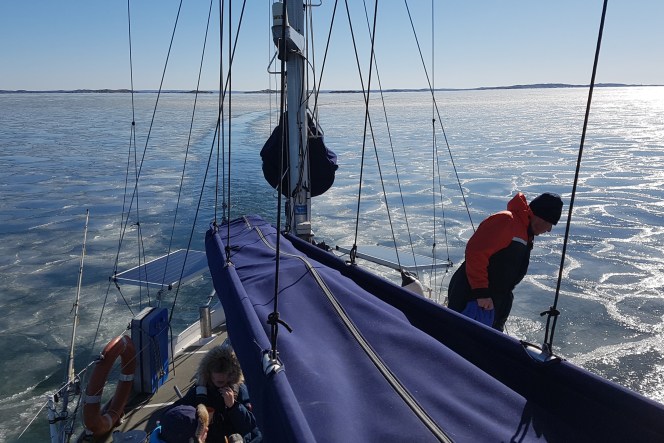 Vi måste fått in is i kylsystemet, säger jag och skyndar mig att stänga av motorn. Ludvig går ner i motorrummet för att undersöka saken. Filtret är fullt av slush. Ingen fara. Filter kan tömmas, och vi är snart på väg igen. Fem minuter senare är det samma sak igen. Proceduren upprepas, om och om igen. Tills vi äntligen är ute på öppet vatten. Skönt, det är över. Eller?