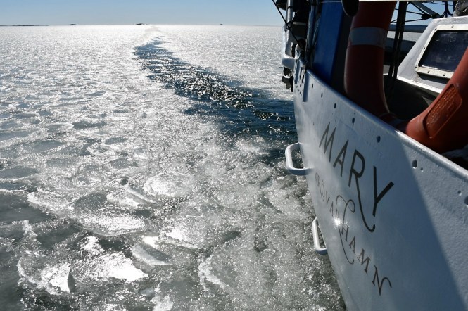 Vi drar bak båten, tar sats och lägger full gas framåt. Det går fort, och det går bra. Förvånansvärt bra. Ut ur hamnen. Mot öppet hav. Mary klyver isen fint. Lovis står på första parkett i fören, Otto betraktar det hela från sin favoritplats i bomkapellet. Långt där ute kan man ana en blå strimla vatten. Det här var ju riktigt roligt. Vilket äventyr.