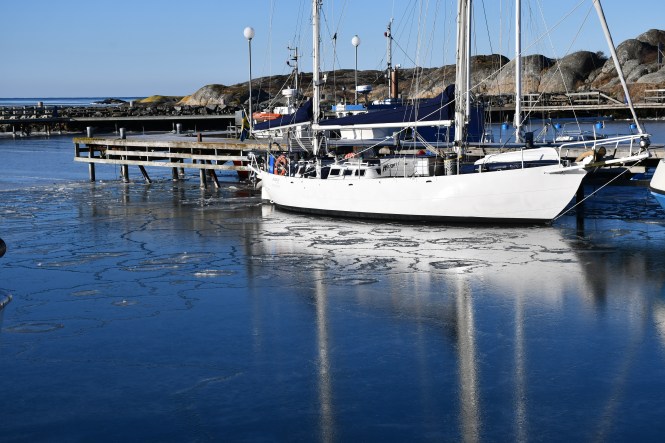 Nästa morgon är båten täckt av ett tjockt snötäcke. Till min förvåning har någon skottat hela gångvägen från land och ut till vår båt längst ut på bryggan. Det visar sig vara Hans-Erik, en pensionerad fiskare i byn. Så otroligt omtänksamt.