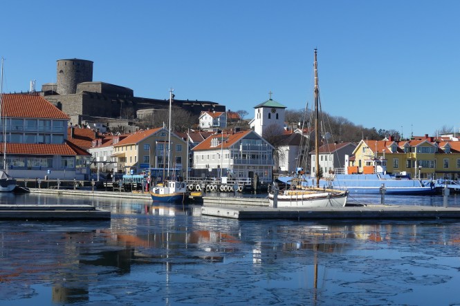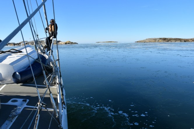 Marstrand är nästan alltid isfritt, det är därför samhället ligger där det gör. Vi hoppas på det. Vända om känns inte som ett attraktivt alternativ. Och mycket riktigt. Så snart vi rundat Ärholmen luckrar isen upp sig. Små motorbåtar tuffar runt på söndagstur mellan fläkten. En man passar på att paddla runt ön på sin SUP i det vackra vädret. Fågellivet sprudlar och folk är ute och promenerar. Vi är framme vid våren. Vi är hemma!