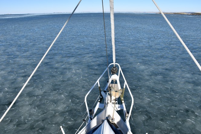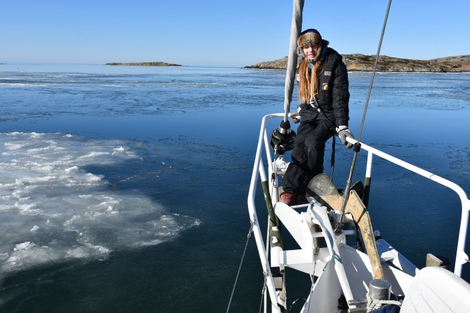 Här i ytterskärgården är vattnet fortfarande öppet med undantag av några enstaka vikar. Vi hade nog hoppats det skulle vara lite mer fruset, att bryta is är kul i lagom dos, men får nöja oss med lite slush och några enstaka isflak här och var.