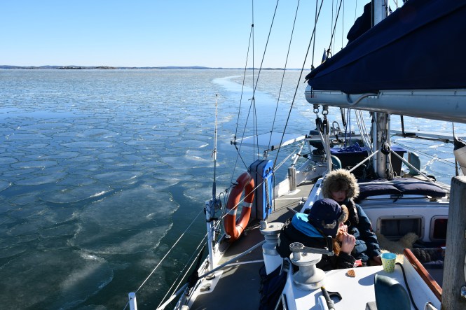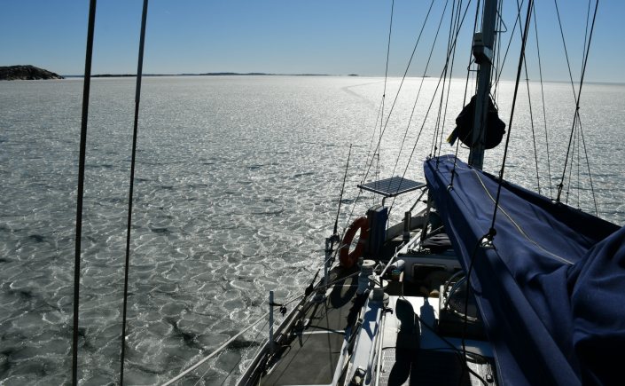 Vi får klara oss själva. Jag kollar tidtabellen, det är 3 timmar hem med färja, buss och tåg, men det bara två timmar med båt – under normala omständigheter. Vi måste ju försöka. Jag startar motorn,  lägger i växeln och låter propellern jobba vid bryggan ett tag. Det funkar. Isen bakom oss spricker upp när vattnet sätts i rörelse. Snart har vi fritt vatten några meter bakom oss.