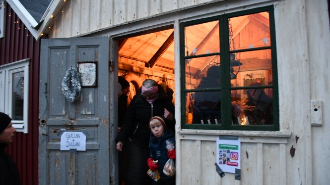 Nu står dörrarna välkomnande på glänt. Det är pyntat med girlanger och julbonader, och i varje bod finns ett litet bord där försäljarna bjuder ut sina varor. Hembakade bullar och saffransbröd, ljunghonung och vaxljus, stickade strumpor, virkade grytlappar och rökt fisk. Det mesta från Åstol, eller öarna runt omkring.