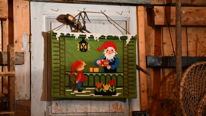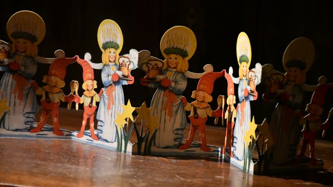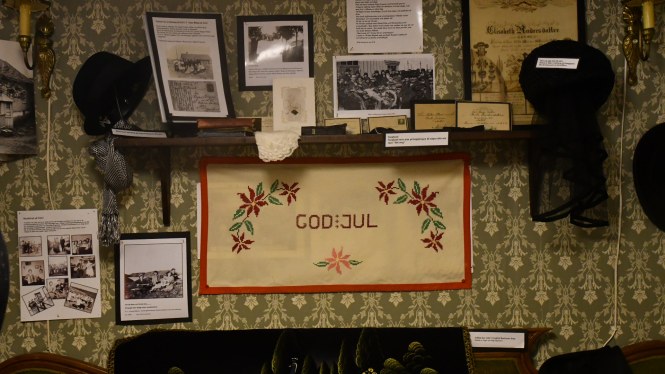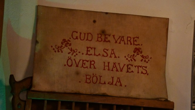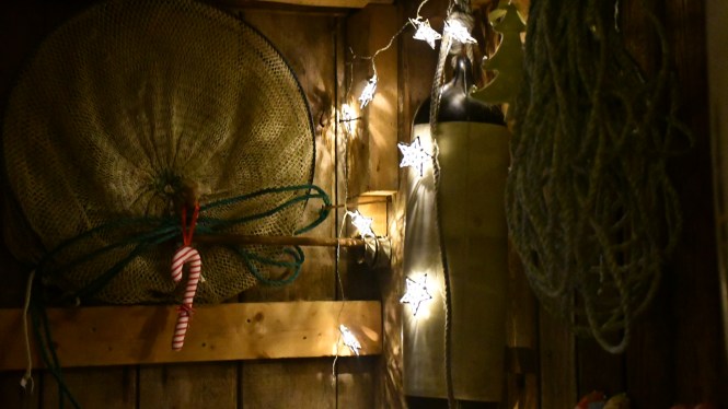 I en av de större bodarna ligger hembygdsmuseumet. Här har man julpyntat som i forna tider. En söt tant bjuder på glögg och berättar hur man firade jul på ön när hennes far var liten pojk. Jag älskar sånt. Kan lyssna i all evighet. Barnen smiter bort till tomten vid granen. Han som berättar kluriga gåtor, och belönar de som gissar rätt med en omsorgsfullt inslagen tablettask.