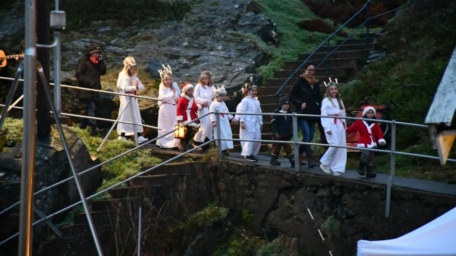 Man blir alldeles rörd när man tänker på hur de måste röjt och fejat i sina bodar inför helgen. Alltsammans är så mysigt att man nästan smäller av. Inte blir det sämre när en hel rad små lucior kommer lufsandes nedför stentrappan mot hamnen. Det är något alldeles speciellt med små overallklädda barn med luciadräkter ovanpå. Och deras späda små röster. Man smälter liksom inifrån.