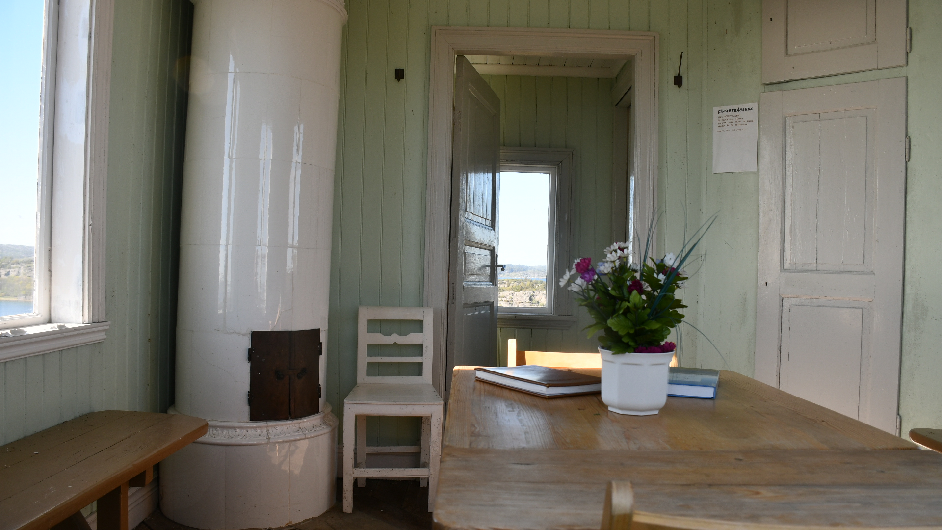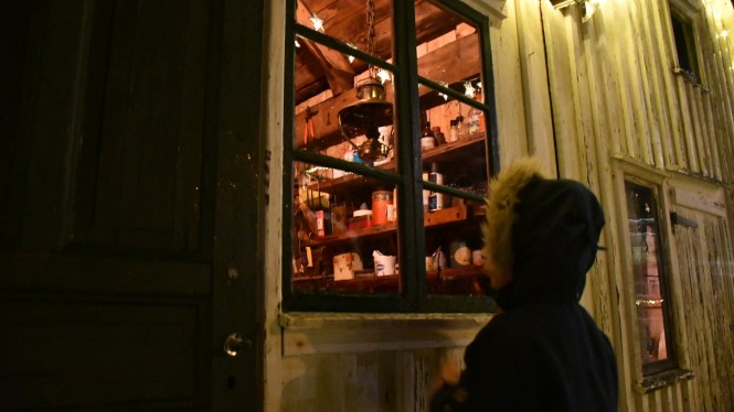 Den lilla stugan är tyvärr låst så här års så vi får nöja oss med att kika in genom fönstret.