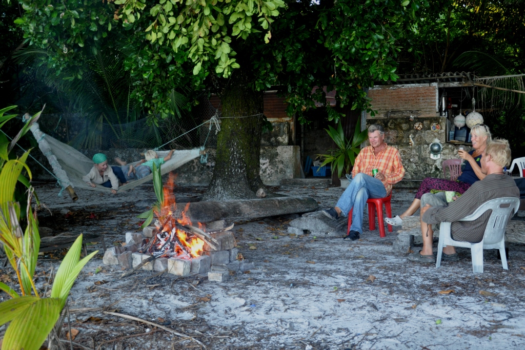 Vi tar en paus, på den långa sandudden längst i söder. Ludvig öppnar Ottos kokosnöt, sedan några till. Barnen badar i det grunda sundet, åker snålskjuts med strömmen. Själv strövar jag runt och fotograferar på måfå. Spåren efter sköldpaddorna som grävt ner sina ägg i sanden. De perfekta små öarna som omger den fiskrika lagunen. Sandbankarna där tärnor och noddys häckar. De vackra tropikfåglarna som seglar högt där uppe. Fregattfåglarna längre ner.