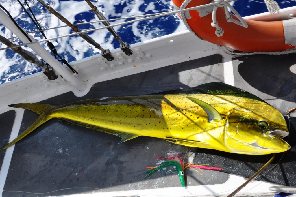 Hela familjen samlas i aktern. Ludvig är upptagen vid spöet. Jag tar in Lovis lina, så att fiskarna inte ska sno in sig. Jag vill inte heller riskera ytterligare napp. Guldmakrillar brukar hålla ihop. Nästan alltid i par, men ofta många fler. Det sägs att de är monogama; fångar man en kan partnern följa efter båten i dagar. Vi har aldrig sett det själva, men är det sant är det ofantligt hjärtskärande.