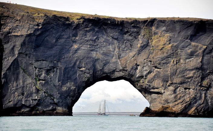 Bakom kalenderns andra lucka gömmer sig denna bild på Dyrhólaey, en klippa som sticker rakt ut från fastlandet på Islands sydligaste spets. En mäktig syn både från land och hav. Tusentals lunnefåglar häckar på klippväggarna, och luften var full av dem. Men de syns inte på bilden. Däremot ser man några små gubbar högt där uppe. Dyrhólaey är populärt bland turister och just den här dagen fick de se något så ovanligt som en segelbåt vid klippans fot. Vår båt. Ludvig och barnen är ombord, medan jag själv sitter ensam i jollen på andra sidan för att ta bilden. Det är få dagar om året som man kan närma sig klippan från havet på grund av den ohämmade atlantdyningen som outtröttligt rullar in mot land här. Och även om vi hade turen att passera en stilla dag så hissade det rejält i vår lilla jolle. Det var inte utan att jag drog en lättnadens suck när jag var ombord på det trygga moderskeppet med min familj igen. Men vad gör man inte för en häftig bild.